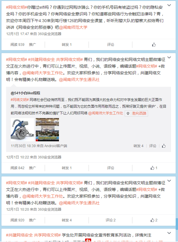 近期,校学生处认真落实教育部、教育厅工作要求,积极动员学生参加“全国大学生网络安全知识竞赛”、“网安启明星”体验活动,组织开展网络安全主题班会、主题微博征文,通过网站、微信、微博广泛宣传网络安全知识,强化学生网络法制意识,帮助学生提升媒介素养。
