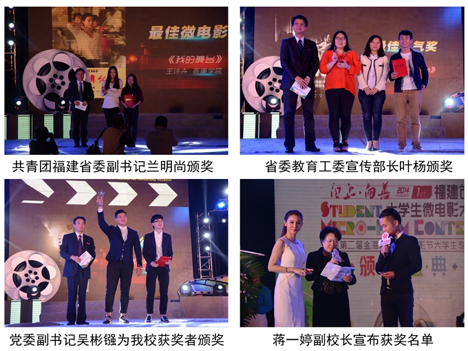 11月15日晚7时,由共青团福建省委、省委教育工委、省教育厅、省学联联和主办,MK体育/mksport体育·官方网站、福建省金海峡微电影文化创意产业园共同承办的2014“向上·向善”福建省首届大学生微电影大赛暨第二届金海峡国际微电影大学生专场颁奖典礼在漳州市华阳体育馆隆重举行。出席活动现场的有共青团福建省委副书记兰明尚、省委教育工委宣传部长叶杨、登录入口党委副书记吴彬镪、副校长蒋一婷,漳州市相关部门领导、福建省部分高校师生代表、金海峡文化创意产业园的相关领导、登录入口各部处院领导以及相关媒体代表。