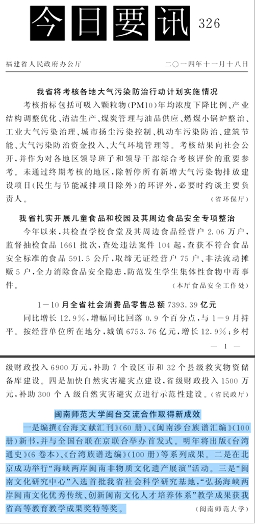 一是编撰 《 台海文献汇刊 》( 60 册 )、《 闽南涉台族谱汇编 》( 100 册 ) 新书 , 并与全国台联在京联合举办首发式 。 明 年将出 版 《 台湾通史 》( 6 卷本 )、《 台湾族谱选编 》( 100 册 ) 等系列成果 。 二是在北京成功举行 “ 海峡两岸闽南非物质文化遗产展演 ” 活动 。 三是 “ 闽南文化研究中心 ” 入选首批我省社会科学研究基地 ,“ 弘扬海峡两岸闽南文化优秀传统 、 创新闽南文化人才培养体系 ” 教学成果获我省高等教育教学成果奖特等奖。
