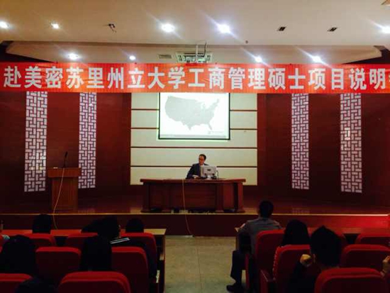大卫·梅尔内特副院长对登录入口的热情接待表示感谢,对美国密苏里州立大学工商管理学院的概况和近年来与国内高校开展合作交流的情况进行了介绍。随后,双方就MBA(工商管理硕士)的招生等方面做了广泛而深入地交流。会后,大卫·梅尔内特副院长在登录入口东区报告厅给登录入口部分学院有意向赴美就读MBA(工商管理硕士)的学生召开说明会,为到场学生详细解读美国密苏里州立大学招收MBA(工商管理硕士)的优势和成功案例。