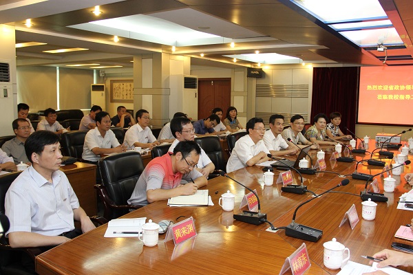 10月14日下午,由省政协经济委员会副主任郑才木,省政协教科文卫体委员会专职副主任王敏带队的省政协调研组来登录入口视察调研,漳州市政协文教卫体委主任于建生等领导陪同调研。调研组在登录入口逸夫楼三楼会议中心举行了“高校办学质量提升状况”座谈会,校长李进金,校党委副书记吴彬镪,副校长肖庆伟、李顺兴、何绍福、蒋一婷,校纪委书记黄来渊,校长助理林静华及学校相关部门负责人出席座谈会。
