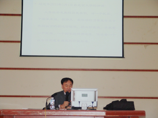 朱教授的讲座共分三个部分,他从儒学是什么、孔子的儒学——原始儒学、作为国家哲学的儒学、朱子与新儒学、作为主流文化传统的儒学、“五四”与打倒孔家店、“极左”思潮下的儒学与港台新儒学七个方面分析了什么是儒学;从儒学的命运多舛却不绝于缕的原因、什么是儒家、儒家的性格、儒家的命运、韩国的儒林、中国当代儒家的崛起等方面综合讲述了什么是儒家;并从“网上流传中国最经典的五十句名言”解译说起,联系“网上一位父亲给女儿的36条建议”谈到朱子家训、习总书记“五四”讲话等方面展示什么是价值观及其对国人的影响。