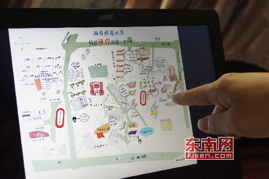 “先由学生手绘,然后扫描到电脑中,进行PS绘图。整张校园地图包括了学校内所有的标志性地点,让新生们以最快的速度熟悉整个校园环境。”闽南师大学生处负责老师介绍,整版的手绘地图均出自学姐学长们的手。整张地图带着浓浓的童心感,逗趣的绘画也让同学们对校园一目了然。