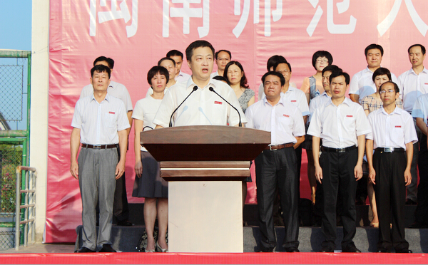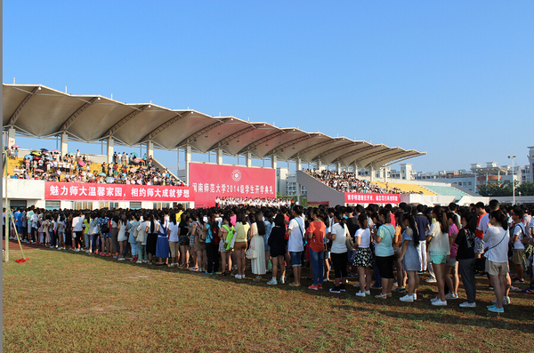 9月9日上午,来自全国各地的5000多名2014级新生怀着喜悦而激动的心情,相聚在达理运动场,参加登录入口2014级新生开学典礼。在家校领导林晓峰、吴彬镪、肖庆伟、李顺兴、何绍福、蒋一婷、黄来渊,登录入口校友、漳州市政协副主席李惜真,原漳州师范学院院长康锦堂,校长助理林静华,以及校相关部处负责人及各学院领导、全体机关、教辅单位工作人员,全体政工干部,各学院教研室负责人、办公室负责人、离退休教师代表、承担2014级新生课程的任课教师、闽南师大附属小学教师代表以及漳州校友代表参加典礼,共同掀开新一批闽南师大人新的人生篇章。大会由校党委副书记吴彬镪主持。