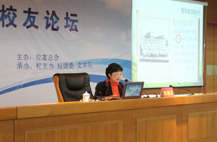 论坛以歌曲《会跳舞的文艺青年》拉开序幕,陈惠贞校友围绕“说与不说、学与不学、写与不写”三个方面与在座师生共同回顾了她几十年的成长历程。“成长就是遇见最好的自己”,陈惠贞校友结合一张张老照片生动地讲述了她在青年教师、巡回演讲、出国交流、公共外交几个阶段难忘的人生经历。随后,她向同学们传授了自己的处事哲学,把困难和坎坷看作一种历练,用积极乐观的心态对待生活,用勤奋向上的精神努力生活,用热诚拼搏的自信笑对生活,人生经过打磨与洗礼,达成“一生只做一件事,一生做好一件事”的理想。