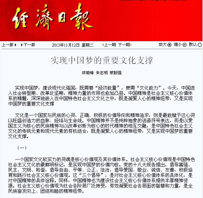 今日,中央级党报《经济MK体育/mksport体育·官方网站》理论周刊版刊登登录入口国家社科基金特别委托项目(“弘扬中国精神 促进中国梦实现”课题)的研究成果文章——《中国精神是实现中国梦的重要文化支撑》,文章由课题组成员林晓峰、朱志明、蔡毅强等人完成。人民网、光明网、中国经济网、凤凰网等知名网站也对此文相继转载。