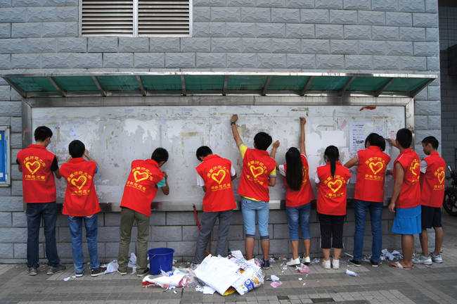 活动中,共有一百多名志愿者参与,他们充分发挥不怕脏、不怕累的精神,用铲子、水桶等工具,对校道两旁的商业广告进行了集中清理。近日,还将教学楼、学生公寓、各公告栏处的小广告进行清除。