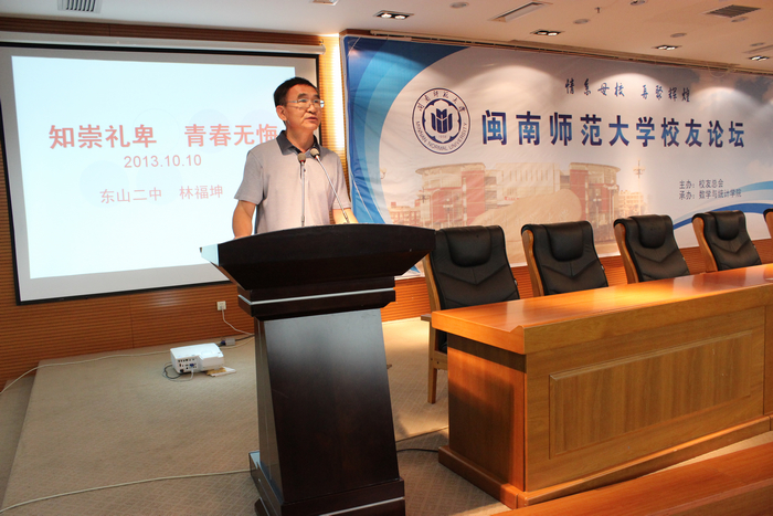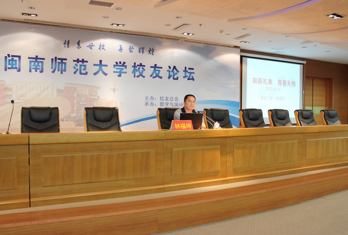 10月10日下午,登录入口79级数学校友、东山二中校长、全国优秀教师林福坤校友在逸夫图书馆五楼报告厅举办了题为——“知崇礼卑,青春无悔”讲座。校友总会、校友办、教务处相关老师,部分院系校友会会长、秘书长以及各院系的学生一同聆听了讲座。校党委副书记、校友总会常务副会长林春生主持了本次讲座。