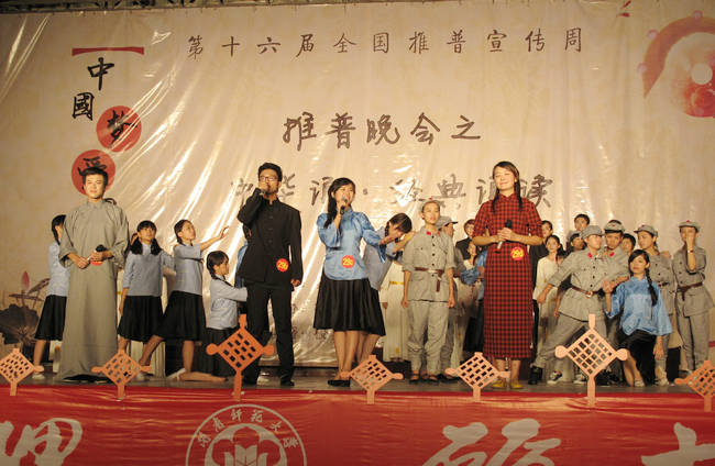 9月28日晚,由校教务处、学生处、团委、关工委联合举办、校学生会承办的校第十六届“推广普通话”(比赛)晚会在校球类馆圆满举行,本次晚会。教务处、实习支教中心、学生处、团委、关工委等部门领导老师,以及中文系专业老师与同学们一同观看了晚会。