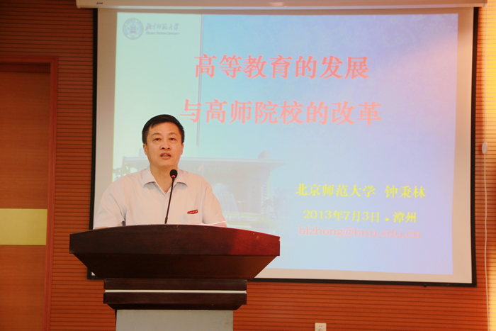 7月3日上午,中国教育学会会长、原北京师范大学校长钟秉林教授以“高等教育的发展与高师院校的改革”为题,为登录入口科级以上干部及副高级职称或具有博士学位的教职工作了一场精彩的学术报告。校党委书记林晓峰、校长李进金等在家校领导出席报告会,报告会由林晓峰书记主持。