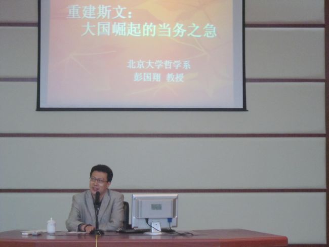 在学术讲演中,彭教授回顾传统,认为历史上中国之所以为泱泱大国不但在于“人口之众、疆域之广、经济之富、军事之强”,更在于“斯文之盛”,所以才能“四方来朝、心悦诚服”,因此在中国重新走向世界、在全球化的时代,在“求富求强”目标逐渐实现之时,如何对传统文化“因革损益”,发挥文化软实力,这是日益国际化的中国在处理国内国际问题时需要注意的,“富而好礼”才能成就大国国民,“威而不猛”也必将在当今霸权横行的世界凸显中国文化的领导力。彭教授认为的“斯文”概念广泛,是对传统的“因革损益”,具有时代性,充满了对现实问题的思考与关怀。