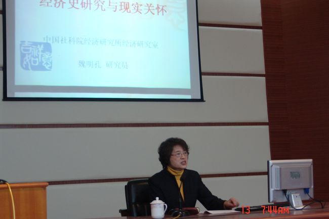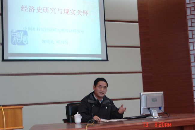 12月12日晚,中国社科院经济研究所所长刘兰兮研究员、经济史研究室主任魏明孔研究员,在艺术系报告厅为师生们开设了《经济史研究与现实关怀》的精彩讲座。 讲座由经济系主任侯曙光教授主持。