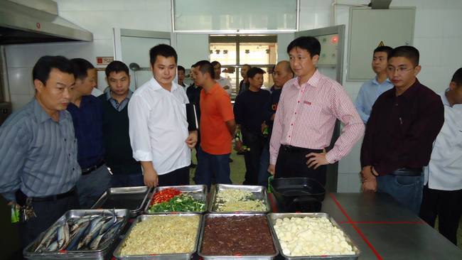 本次参观交流学习的主要内容为中快餐厅后厨、配餐间、就餐大厅、主副食品仓库等功能区硬件设施及员工个人卫生情况、精神面貌等。参观期间,中快餐厅左经理向大家介绍了他们现场管理的“五常法”(常组织、常整顿、常清洁、常规范和常自律),各项操作流程的管理标准、食堂员工日常培训方法及其他中快集团餐饮文化等先进管理经验。