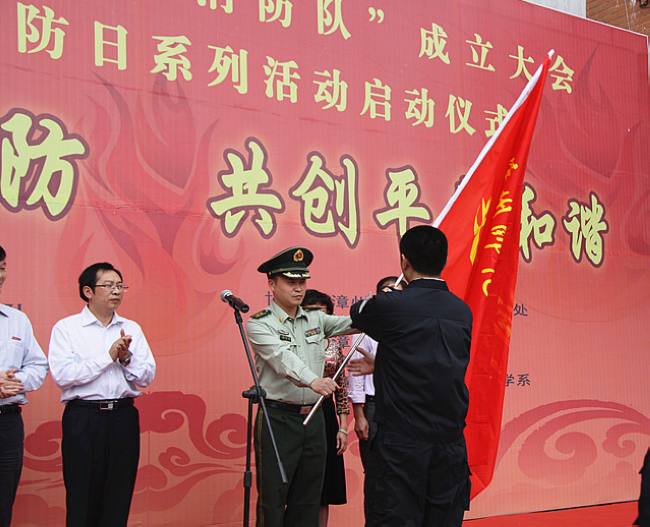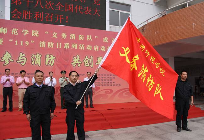 会上,何绍福副校长为“119”消防日致辞,对登录入口今后的工作提出了要求和期望,并宣布“义务消防队”正式成立;随后,庄小平处长为出席活动的人员介绍了“义务消防队”组织机构、职责义务和年度培训计划。漳州市芗城区公安消防大队教导员易仁杰为“义务消防队”授旗。
