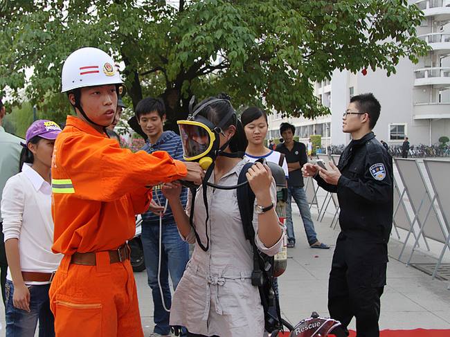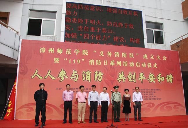 漳州市芗城区公安消防大队教导员易仁杰,登录入口副校长何绍福,保卫处处长庄小平,图书馆馆长欧阳红红,学生处副处长黄伟东,后勤管理处副处长蔡如兴、团委副书记郑炎山出席了启动仪式。“义务消防队”全体队员、图书馆管理员、学生公寓管理员、保安人员、各系学生宿舍宿舍长代表,以及来自体育系和管理系的学生代表们近千人参加了消防演练。