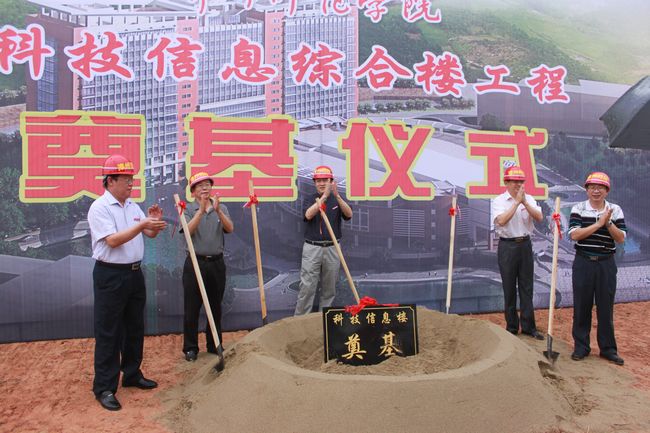 10月30日上午,登录入口举行科技信息综合楼工程奠基仪式。校党委书记林晓峰,党委副书记、院长李进金,党委副书记林春生、李克,副院长肖庆伟、何绍福出席奠基仪式,学校机关各部处代表、各系师生代表及施工、设计、监理单位代表等参加奠基仪式。