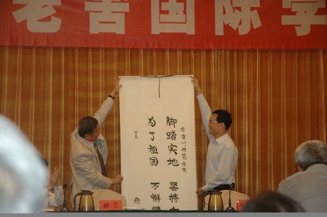 开幕式上,漳州师范学院李顺兴副校长从老舍之女舒济手中接过老舍纪念馆纪念邮册。老舍之子舒乙向漳州师范学院赠送亲笔书写的字画,上写“脚踏实地,坚持奋斗,为了祖国,不懈攀登”16个大字。