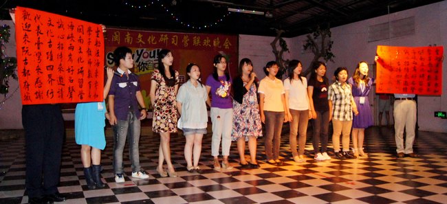 由海峡两岸闽南文化研习营营员共130余人共同参与的联欢晚会于8月3日晚在龙佳山庄举行。 晚会以两岸一家亲为基调,节目精彩纷呈。登录入口艺术团黄婷婷演唱的闽南语歌曲《好胆你就来》在开场后立即调动起全体观众的热情。《舞武声威》的武术表演则体现出闽南的南少林精神。来自宝岛台湾高校的营员们也纷纷登台表演,金门大学的葫芦丝演奏展示出传统民族乐器的魅力,歌伴舞《你是我的花朵》更传递了他们的青春热情。明道大学营员共同完成的书法表演彰显出传统文化的精髓,台南大学的客家歌曲与歌仔戏表演则表达了浓浓的闽南文化情缘。中场的游戏互动环节让两岸高校师生在欢乐的气氛中拉近距离,亲如一家。 晚会最后在全体营员的集体圆圈舞中圆满落下帷幕。