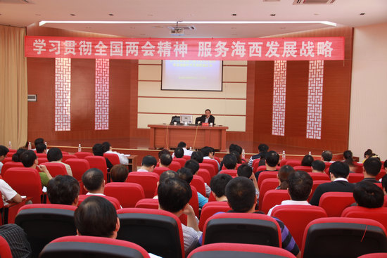 王开明院长首先详细解读了2012全国两会精神,分析了温家宝总理在十一届全国人大五次会议上的《政府工作报告》中关于2011年工作回顾、2012年工作总体部署、2012年主要任务等方面的内容,并着重阐述了《政府工作报告》中制定收入分配改革总体方案、保障性住房建设、居民社会养老保险全覆盖等几大亮点,强调了推进改革的重要性。在报告的第二部分,王院长着重分析了省委、省政府关于重点项目建设战役、新增长区域发展战役、城市建设战役、小城镇改革发展战役、民生工程战役“五大战役”的战略部署,并结合具体的例子,详细阐述了推进福建科学发展、跨越发展的必要性和可行性。
