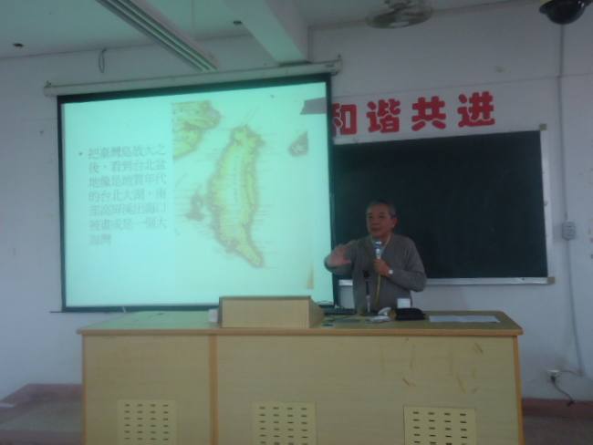 11日下午,台湾佛光大学生命与宗教学系宋光宇在博中403开展了一场题为“从古地图看台北盆地的变化”讲座。首先,宋教授结合自己在台湾的经历,以台湾的风俗习惯为切入点,通过地图为同学们分析了台北地形、地貌在近几年来发生的的巨大变化。其次,宋教授强调了文献资料准确使用的重要性。接着,依据各国各时期的地图介绍了台北地区地形的变化,根据相关理论对台湾地形变化的原因为我们一一解释。最后还介绍了漳州与台湾岛经济开发的联系。
