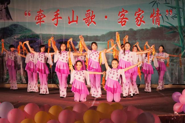 晚会节目形式多样、精彩纷呈。独唱、大合唱、服装秀、群舞等表演为观众献上一场美轮美奂的视听盛宴。“对山歌来时对山歌哎,一人唱来就是两人和哎”曹杵英带来一首《老两口爱唱歌》,甜美的歌喉、清脆的嗓音、欢快的语调唱出了客家人民幸福快乐、安居乐业的生活。客家山歌协会新成员表演的服装秀《心》,以其简约的短装、摇曳的长裙展示了客家服饰的独特韵味。而王远芳等人表演的音舞诗《我们是客家人》,以动人的歌曲、美妙的舞姿、深情的演唱述说了客家这个独特的民族“一条扁担走天下”的心路历程。最后,晚会在《请到客家来做客》中圆满落下帷幕。