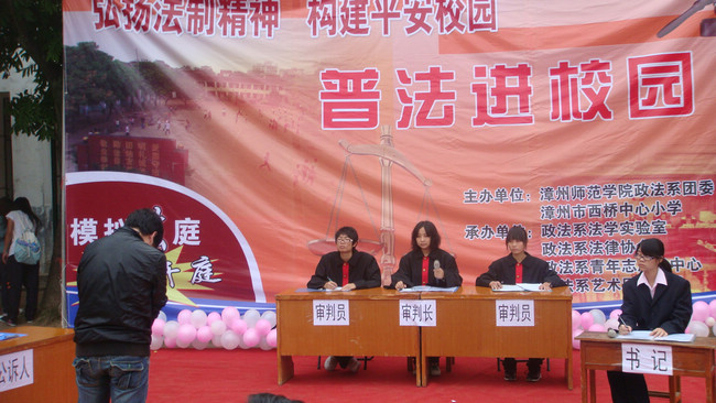 为进一步深入开展校园志愿服务活动,充分发挥高校服务地方社会功能,近日,由登录入口政法系团委精心组织的“模拟法庭进西桥小学”活动在漳州市西桥小学顺利举办。政法系团委书记王中坚及该系辅导员、西桥小学校长陈华漳、书记林建荣等出席本次活动,西桥小学全体师生一千余人观看了本次“模拟法庭”活动。通过大手牵小手,共谱法制校园之歌。