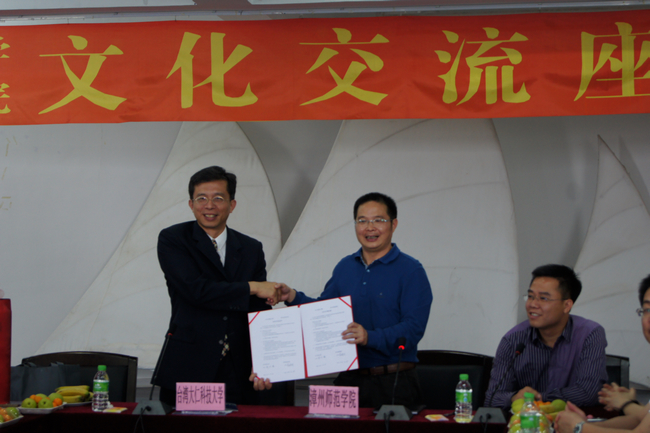 座谈会上,宾主双方先后介绍了各自学校的办学历史、办学规模、学科建设等学校基本情况,并就如何具体实施两校教师及学生互访交流等方面进行了实质性洽谈。会上,两校代表还签订了《合作办学备忘录》,希望两岸学校加强交流、加深友谊、推进合作和共同发展。最后,两校学生代表分成六组进行进一步的交流,整个交流会在热烈友好的气氛中进行。