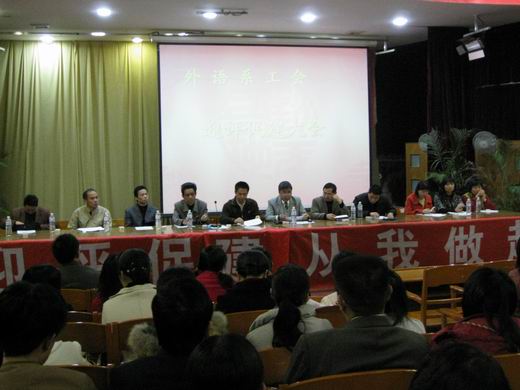 为做好迎评准备工作,统一全系教职工的前进步伐,1月17日下午,外语系于大梯教召开工会迎评促建大会。系主任胡郑辉、党总支书记罗瑛、系副主任游耀金、黄宁夏、党总支副书记罗炎成及欧阳耿、吴克炎老师等出席了本次大会。会议由罗瑛书记主持。