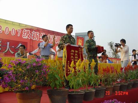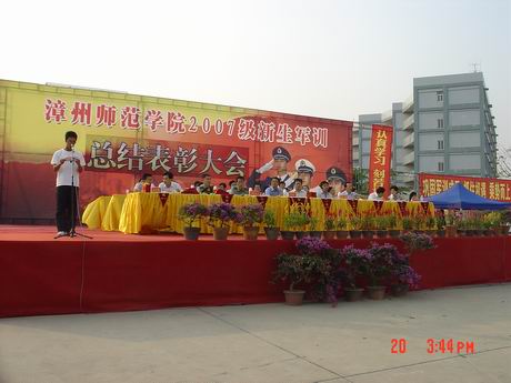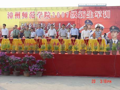 10月20日下午,晴空万里,2007级新生军训总结表彰大会在瑞京篮球场隆重举行。院党委副书记林春生、副院长肖庆伟、漳州市军分区后备办主任李新长、司令部参谋陈宙峰、院各部处领导以及各系党政负责人出席了会议。院学生处处长林静华主持大会。