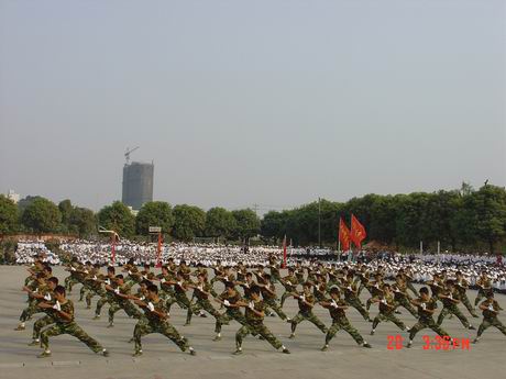 雄壮的国歌声过后,从八十五个参训班级中脱颖而出的化学系环境科学2班和体育系体育教育1班代表18个优胜班级进行了精彩的队列表演。紧接着,由64名男同学组成的方队表演了格斗操,他们身着迷彩服,英姿飒爽,动作整齐划一,充分展示了师院男儿的冲天豪气,赢得了在场观众一片喝彩;64名教官的军体拳表演更是威武有力,气吞云霄,让全场师生再次领略了英勇善战的当代军人风采。