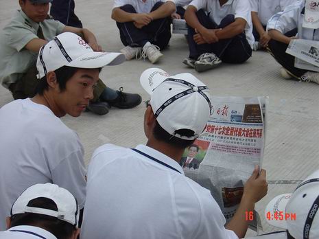 我院新生军训正在热火朝天地进行中,在十七大召开之际,院学生处购买了300多份十五、十六日有关十七大报道的报纸,分发到训练场上的85个班级,组织全体新生、教官一起在训练间隙进行学习、讨论,让他们既不耽误训练,同时也能感受到党的十七大扑面而来的振奋和激励,鼓舞训练士气。