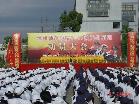 10月8日上午,瑞京篮球场上国歌雄壮、红旗飘扬,我院2007级新生军训动员大会在此隆重举行,4500多名新生将迎来两周充实紧张的军事训练生活。此次大会学院高度重视,院党委副书记林春生、院学生处处长林静华、教务处副处长林钧锋、各系书记、副书记及漳州军分区后备办主任李新长、司令部陈宙峰参谋、73336部队邱卫红副教导员出席了大会,动员大会由林静华处长主持。