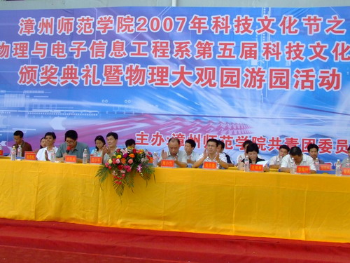 5月27日下午4:00,物理与电子信息工程系第五届科技文化节颁奖典礼暨“物理大观园”游园活动在达理公寓学生管理中心隆重举行。院保卫处处长庄小平、院团委副书记朱百里,物电系党政领导、各兄弟系团委代表,漳州一中、漳州三中等中学校长,漳州无线电协会、漳州科华电子、漳州科能电子、万利达优科电子等企业负责人应邀出席颁奖典礼,并参加“物理大观园”游园活动。