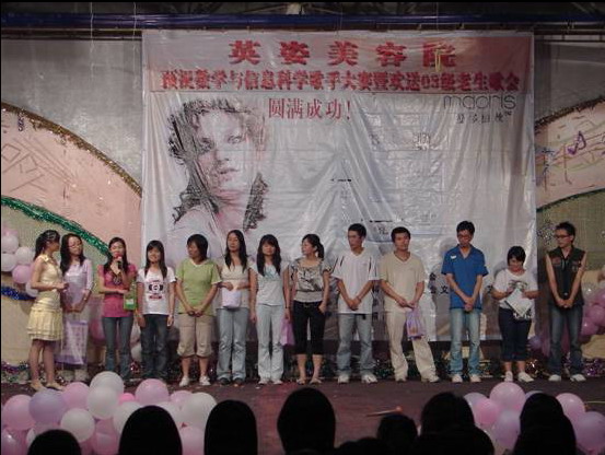 为选拔文娱人才及欢送03级毕业生,5月19日晚,数学与信息科学系在芙蓉四楼举办了“歌手大赛决赛暨欢送03级毕业生歌会”,莅临本次歌会的有系党总支副书记林梦雷、系团委副书记林贵东、系辅导员、商家代表及全系同学。本次歌会还得到了英姿美容院、宝岛眼镜店等商家的大力赞助。