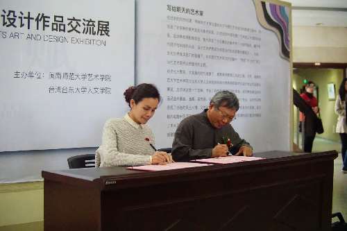 本次交流展开启了两校各领域交流的序曲,共展出MK体育/mksport体育·官方网站艺术学院及台湾台东大学人文学院学生作品60余件,作品涵盖水墨画、油画、装饰画、设计、陶瓷艺术、动画等多个专业。开幕式上,MK体育/mksport体育·官方网站艺术学院还与台东大学人文学院签订了院际交流合作协议,双方将在教师与学生互访、学术资讯及图书教材资源交换、学术研讨等领域开展交流与合作。