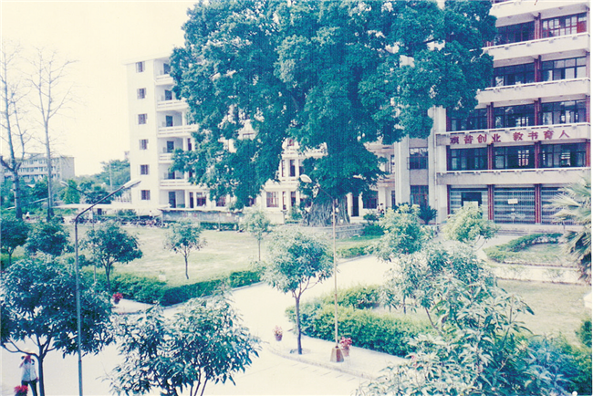 建成于1992 年的学校图书馆,两侧有三棵高大的木棉树,暮春时节,树叶落尽,开满了一树的红花。每当凤凰花开,木棉飘絮的时候,这个学校,又将送走一批即将毕业离校的学生。