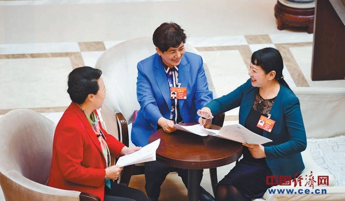 3月11日,按照十三届全国人大二次会议日程安排,人大休会一天。人大河北代表团全国人大代表张淑芬(中)相约全国人大代表靳灵展(右一)、郭素萍热议习近平总书记在人大福建代表团的重要讲话。 经济MK体育/mksport体育·官方网站-中国经济网记者 李景录摄