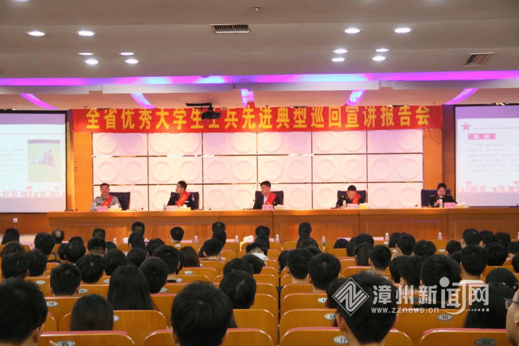 漳州新闻网讯(林正锋 章铭竞/文 林正锋/图)为了广泛宣传优秀大学生士兵先进事迹,激励广大青年大学生踊跃参军报国, 3月30日上午,2019年全省优秀大学生士兵先进事迹巡回宣讲走进MK体育/mksport体育·官方网站。省教育厅、省征兵办、漳州军分区、芗城区人民武装部、龙文区人民武装部、漳州地区各高校征兵工作站老师及400多名有志于参军入伍的学生参加宣讲会。