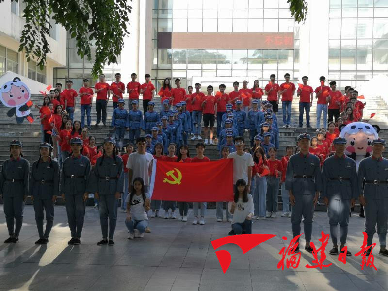 在教学楼前,学生党员身着红军服,以歌舞快闪的形式表演《我和我的祖国》。党员们摆出“70”和爱心等各种图案,伴随着悠扬的旋律,学院党建吉祥物党“e”宝和学院师生党员一起挥动手中的红旗,深情演唱《我和我的祖国》。活动也吸引众多师生围观驻足,大家纷纷加入歌唱队伍,一起唱响金秋最美的爱国之歌。