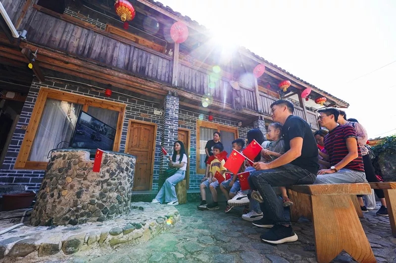 在南靖县云水谣景区内,一座名叫1949的土楼民宿内聚集了前来观看阅兵式的游客们。 谢威 摄
