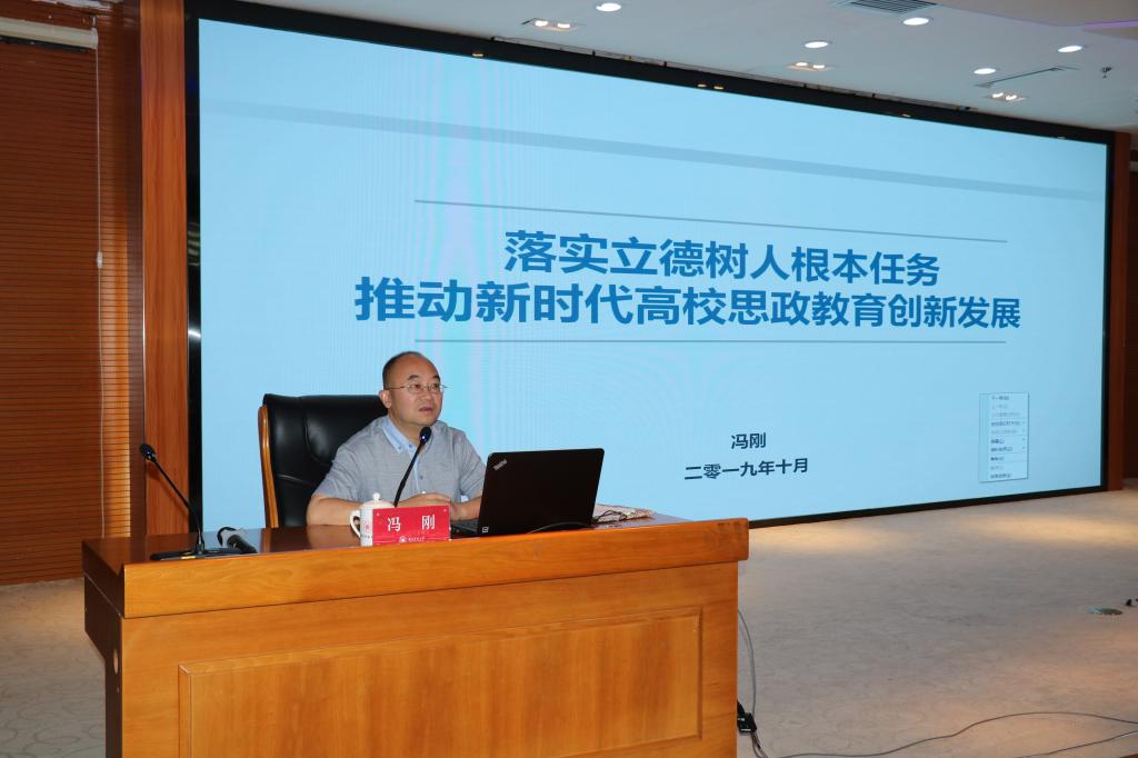 报告中,冯刚教授围绕“改革开放以来高校思想政治教育政策发展”“学习全国高校思想政治工作会议、全国教育大会和思想理论课教师座谈会精神”“落实完成好高校立德树人根本任务的重点工作”三个方面做了详细阐述。冯教授系统梳理了改革开放以来高校思想政治教育政策演变过程,深入解读了全国高校思想政治工作会议、全国教育大会和习近平总书记在学校思政课教师座谈会上的重要讲话精神,提出要在思想政治工作中把准方向、遵循规律、激发动力、讲求实效。他指出,思想政治教育工作者要“因事而化、因时而进、因势而新”,认真开展高校思想政治教育工作热点问题研究,努力做有思想的行动者和关注实际问题的研究者;要结合新时代大学生特点有针对性地开展思想政治工作,不断推动思想政治教育工作创新发展,全力完成好高校立德树人这个根本任务。