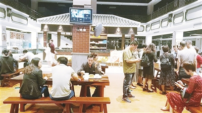 在漳浦闽南文化城餐厅里,游客一边吃饭一边观看厨房监控。
