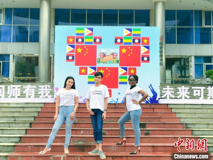 菲律宾青年夏贝尔(中)与另外两名回校的外国毕业生一起拍照留念。 夏贝尔供图