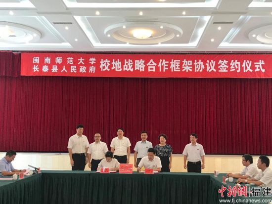 中新网福建新闻8月10日电(朱志成)近日,闽南师大与长泰县人民政府校地战略合作框架协议签订仪式在长泰县人民会场举行。闽南师大党委书记吴彬镪,校长李顺兴,校党委常委、副校长蒋一婷,校党委常委、副校长张龙海,漳州市人大常委会副主任、长泰县委书记方木荣,长泰县委副书记、县长蔡绿璇等出席签约仪式。李顺兴与蔡绿璇代表双方共同签订校地战略合作框架协议,仪式由长泰县副县长沈元标主持。