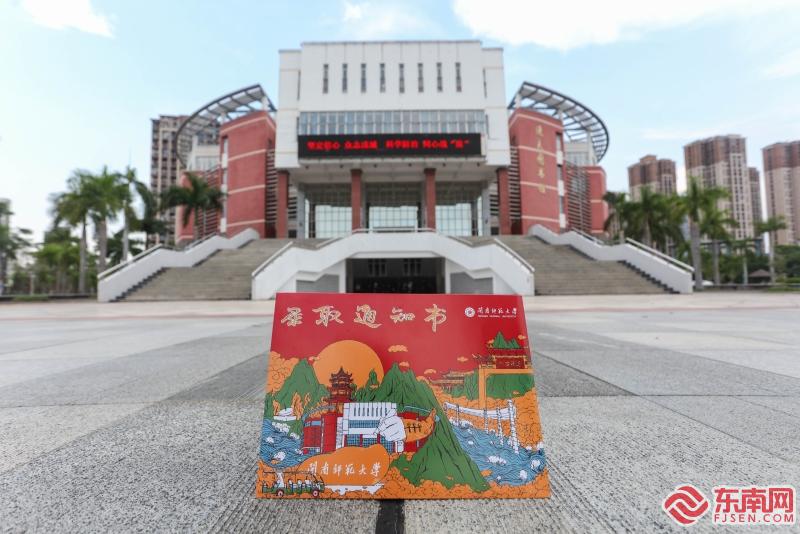 随录取通知书一起寄出的还有一个小福袋,寓意闽南师大精神、薪火“代代(袋袋)”相传。袋中有四条做成书签的“锦囊妙计”,分别是“博学”“明理”“砺志”“笃行”,希望学生从入学开始就铭记和践行校训精神。此外还有明信片和卡套,明信片同样运用漳州木版年画的技艺,展现了南靖土楼、东山风动石、闽南古厝庙宇、圆山、水仙花、白鹭等多个闽南文化元素,体现了闽南文化的积淀;卡套的设计结合闽南古厝(马鞍脊)的建筑特色风格,配上红色的吉祥结,传递了学校对新生的美好祝福。小福袋和卡套除了具有收藏价值,还兼具实用功能,小福袋可用来日常收纳,卡套可放置同学们的餐卡、银行卡等,是艺术性与实用性相结合的作品。