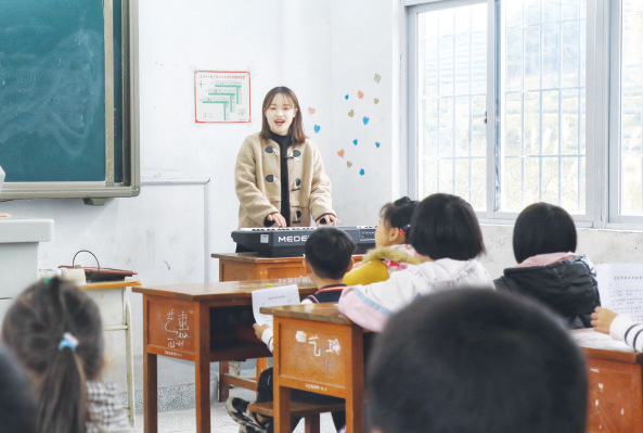 下午的第一节课,卓玥老师准时为高竹小学的19名孩子带来音乐课,课的内容是教唱《雪花带来冬天的梦》。“小朋友们先跟我念一下歌词,‘做个甜美的梦,等那春风姑娘把你们来唤醒……’”在卓玥的带领下,小朋友们整齐划一地朗读歌词。