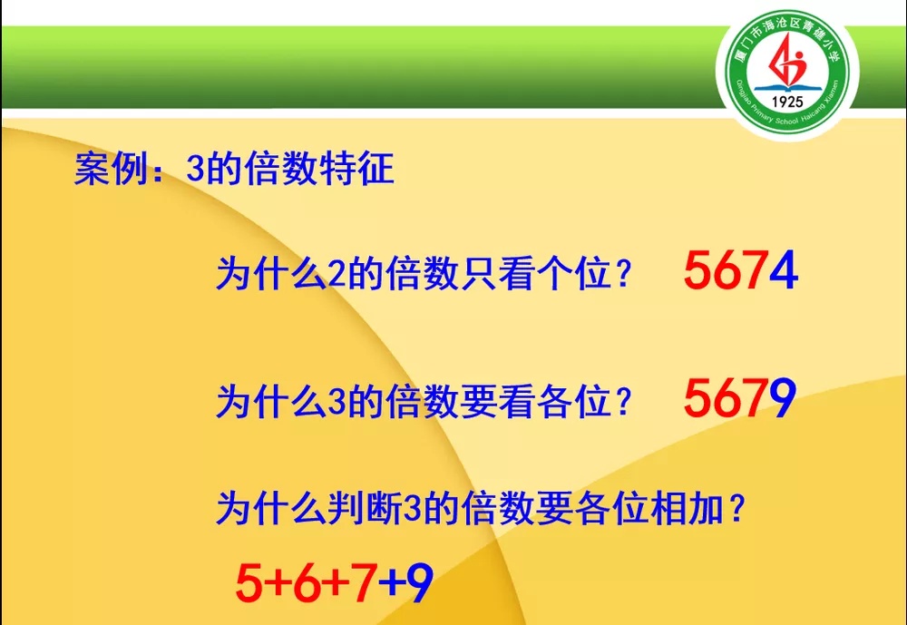 学习教学的最好方法就是研究案例。为什么2的倍数只看个位,而3就不行呢?为什么3的倍数要看各个数位上的数相加的和呢?李老师的讲座让我们深刻感受到,教师首先要“懂”,其次再考虑怎么让孩子“懂”,要变“知其然”为“知其所以然”,创设有理有趣的情境,符合学生的年龄特点和认知规律,引导学生积极思考,深度学习,趣味说理,这样才能构建高效、理趣的数学课堂。