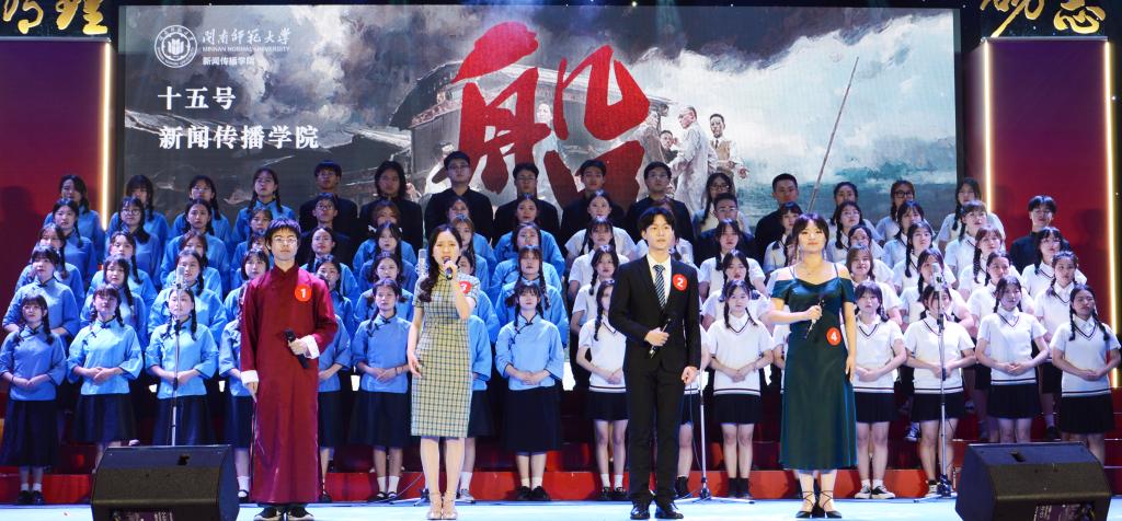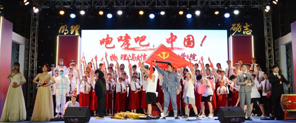 物理与信息工程学院带来的朗诵《咆哮吧,中国!》,通过夜幕、月升、星繁三个篇章,结合笛子独奏、武术表演、话剧演绎等多种形式,将中国近100年来的风风雨雨画卷式呈现在观众面前。新闻传播学院将昆曲元素《单刀会》融入表演,化用唱词“孩子们,船啊,这不是水,是一百年流不尽的英雄血”,象征百年党史的波澜壮阔,赢得了现场观众的热烈掌声。