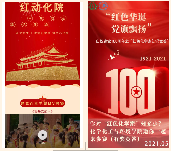线上线下同向齐发力,奏响党史学习教育“协奏曲”。用互联网思维推动党史教育观念创新、方法创新、工作创新,为“红色馨风讲堂”插上“数字翅膀”。通过“现场学+云端学”直播形式,学生在B站直播间通过实时弹幕,与主讲人开展现场互动,实现党史教育向注重学生主体参与感、现场代入感转变;学院微信公众号推出“红动化院”专栏,配合“红色馨风讲堂”,每天推送丰富的历史文献,帮助全院师生在红色记忆中,学而思、思而践、践而悟、悟而学;开展“红色化学家故事我来写”线上征集,收集学生原创作品100件,百篇征文献礼党的百年华诞;举办“红色化学家线上知识竞答”,吸引近千人次参与,实现党史教育由“面对面”向“键对键”相结合、齐发力转变。