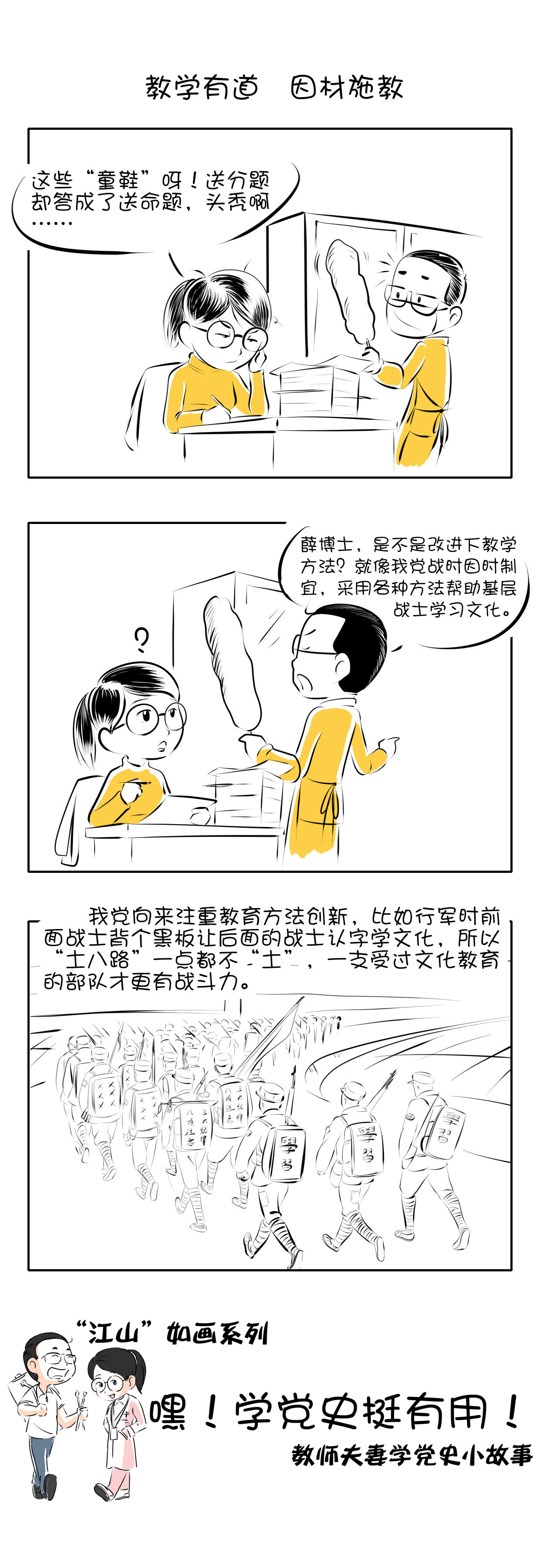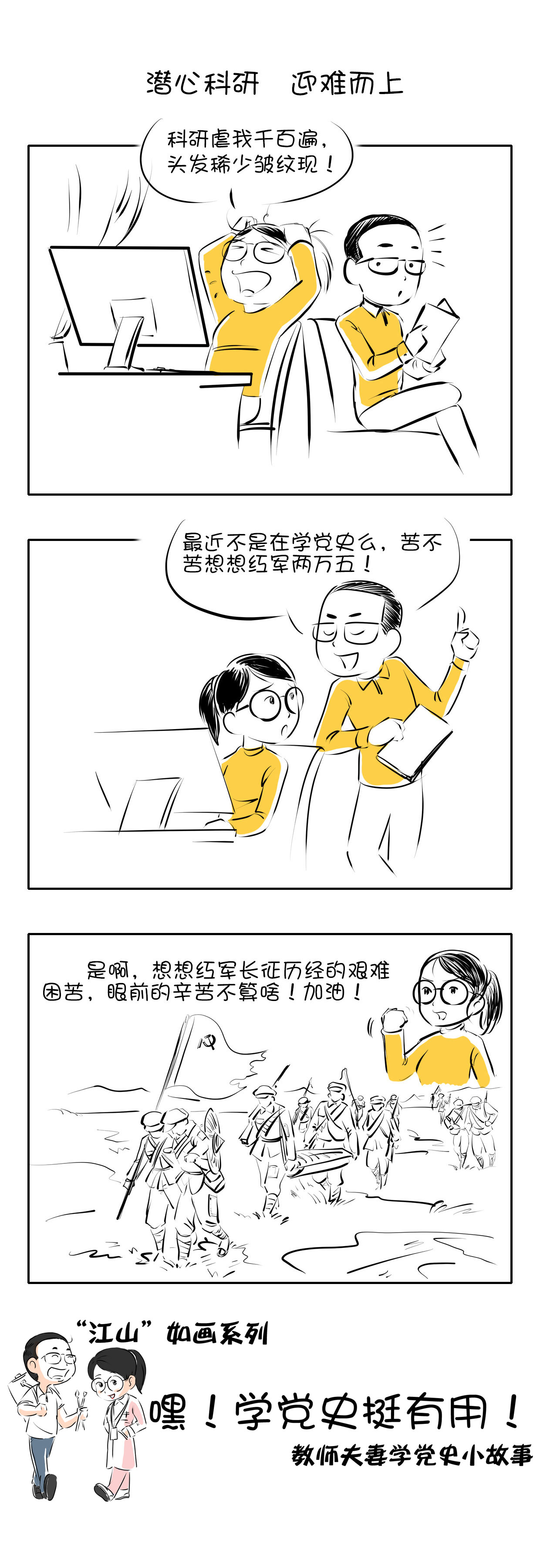 该作品从教师视角将党史学习与教学、科研、创新、创业、日常生活等方面紧密联系在一起,采用贴近生活、通俗易懂、风趣幽默的长漫图形式,反映了学党史的实用性。